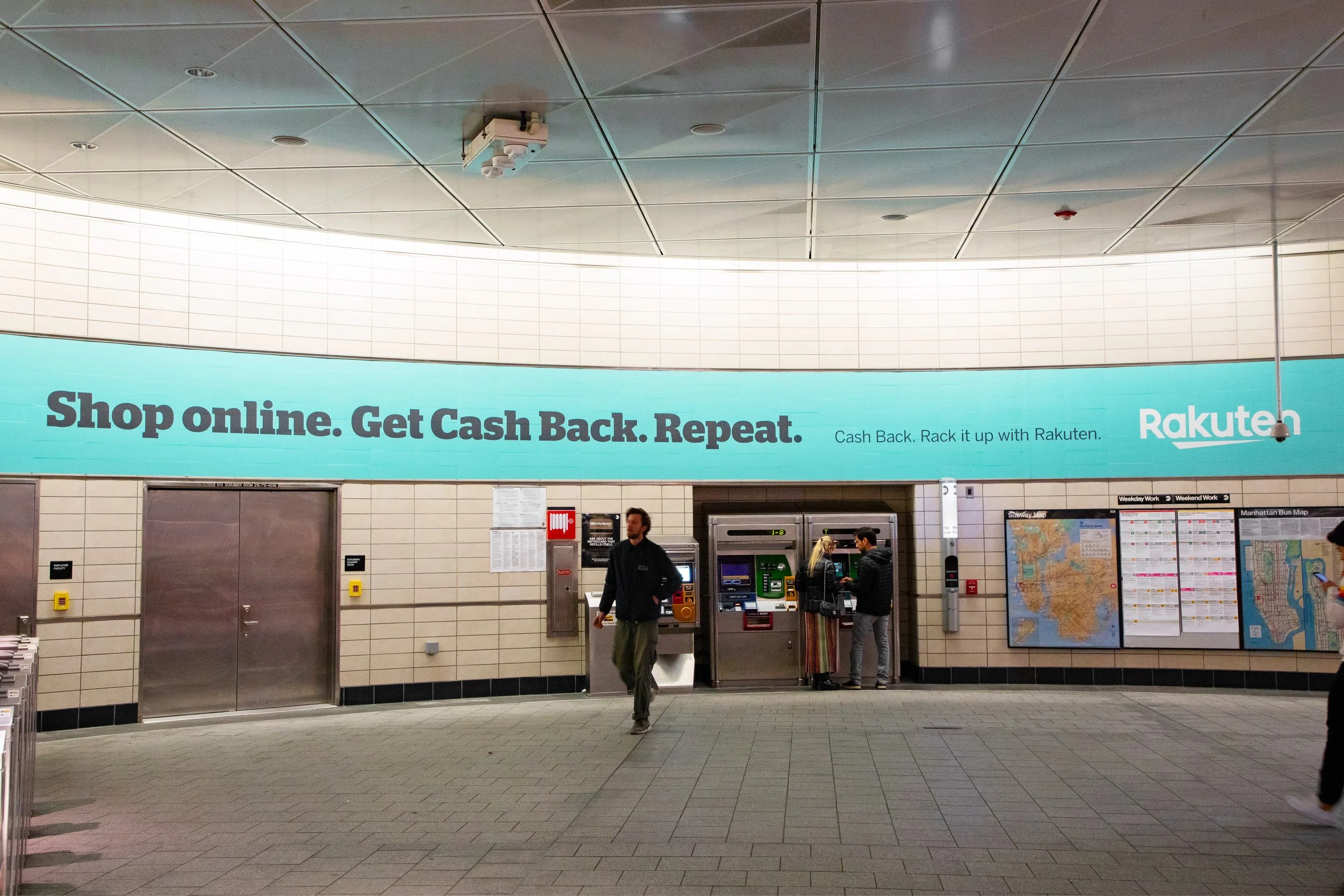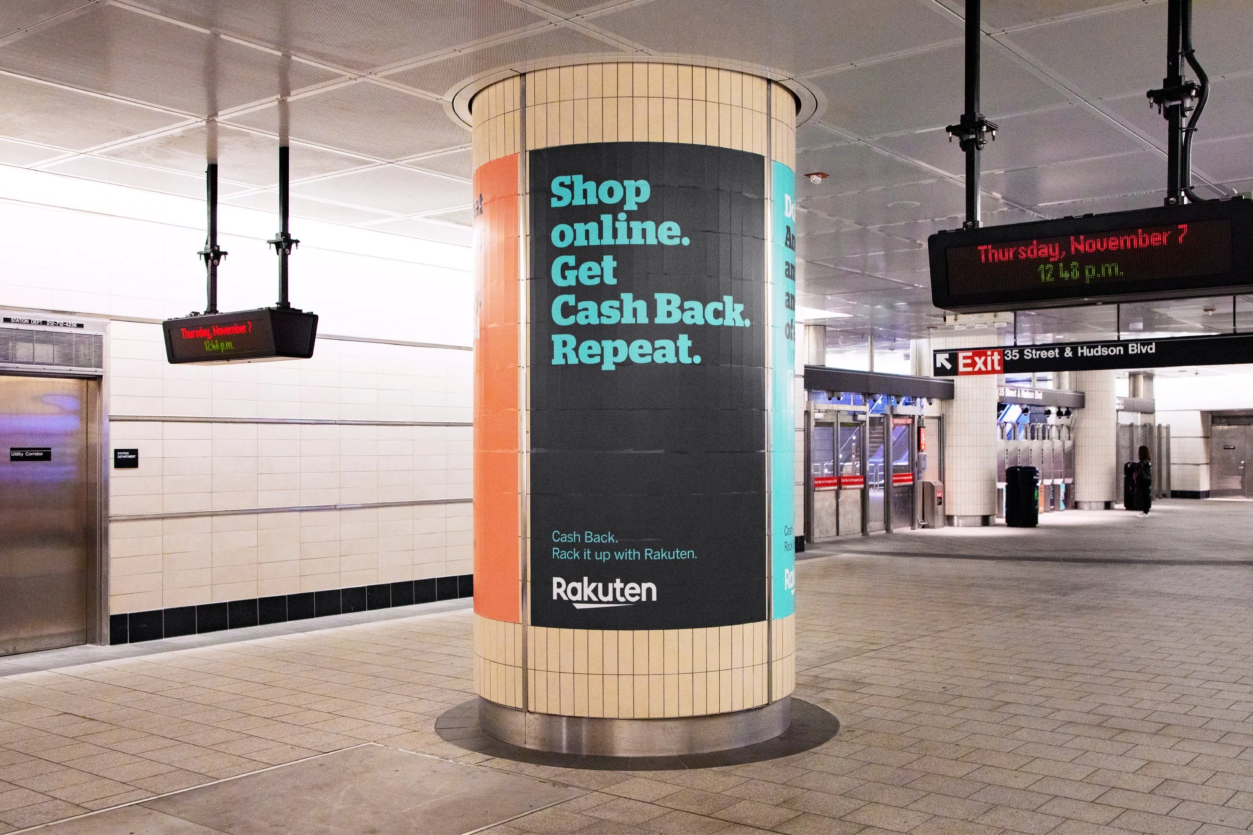 To extend the “Cash Back, Rack it Up.” brand message of Rakuten, we kicked off a nationwide out-of-home campaign featuring large scale subway station takeovers in New York and San Francisco. The copy-driven campaign evolved the conversational approach of the television campaign into a no-nonsense, straight-talking tone of voice—delivered with a bold, clean design approach.