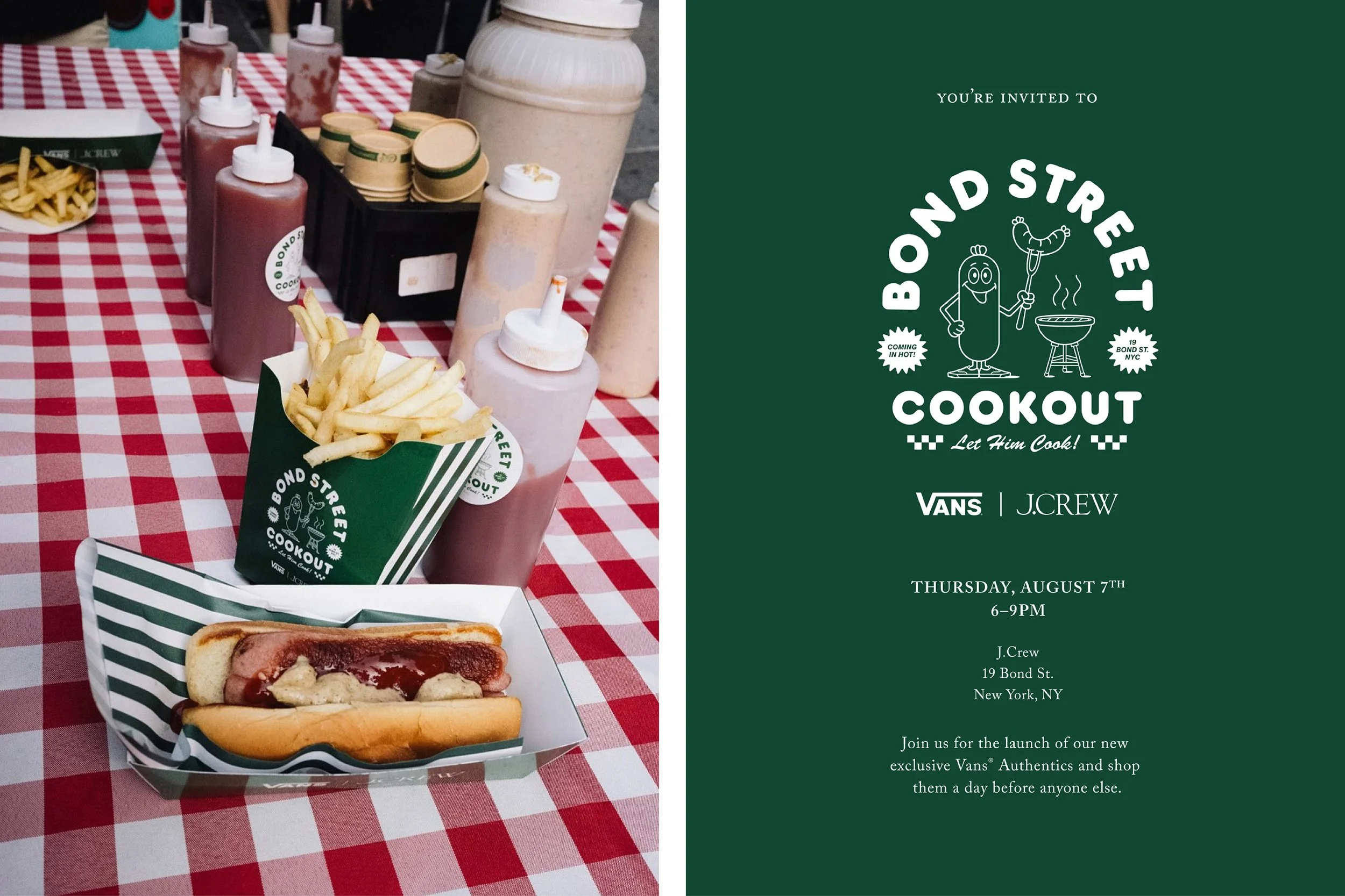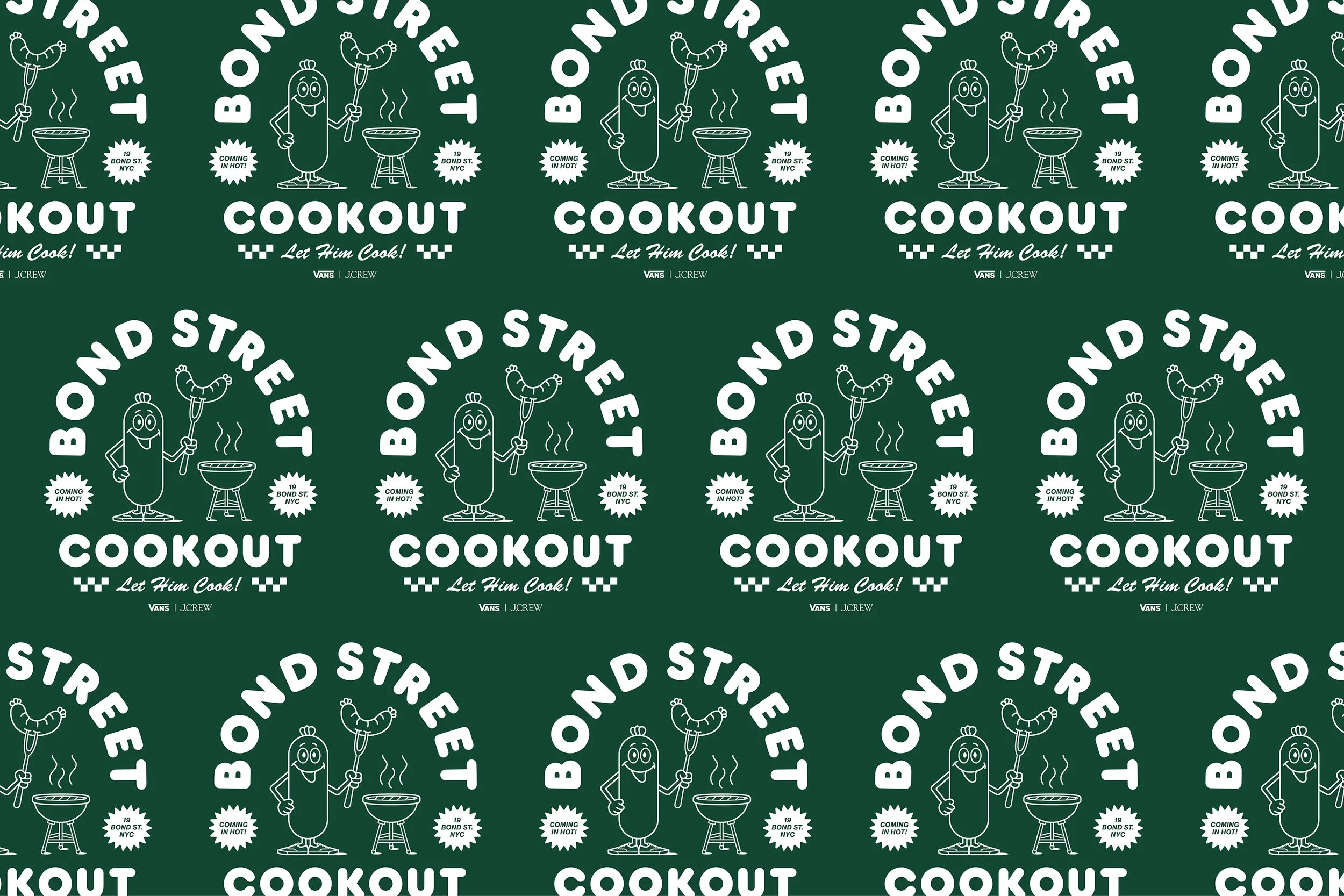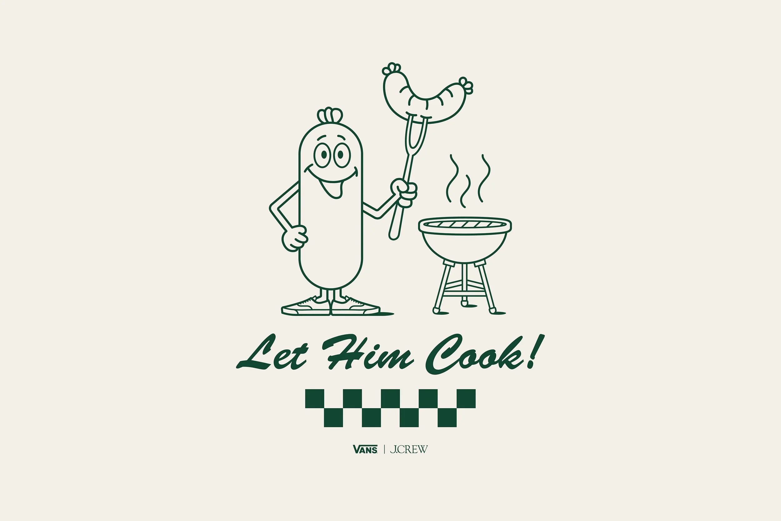 To help celebrate their newest collab with Vans, we worked with the J.Crew men’s team to create a suite of graphics for their cookout-inspired event. With the simple directive “make it fun,” we quickly imagined a hot dog manning the grill while rocking a pair of Authentics. Our line “Let Him Cook!” anchored the graphics which flexed across aprons, tees, napkins, stickers, packaging and more. Photos by J.Crew, JohnD.